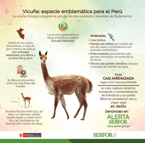 Por esos motivos, el Decreto Supremo N° 004-2014-MINAGRI declaró a la vicuña como especie amenazada, por lo que su caza, captura, tenencia, transporte o comercialización de individuos y su fibra sin acreditación de su origen legal es un delito. En ese sentido, el Servicio Nacional Forestal y de Fauna Silvestre (Serfor) instó a la ciudadanía a denunciar la ocurrencia de estas situaciones que ponen en peligro la supervivencia de las vicuñas.