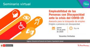 Participa del seminario virtual: Empleabilidad de las Personas con Discapacidad ante la crisis del COVID-19 📆 Fecha: jueves 25 de junio de 2020⌚ Hora: 3:00 p. m. Inscríbete aquí 👉 http://www2.trabajo.gob.pe/prensa/charlas-y-eventos/ ¡Vacantes limitadas!