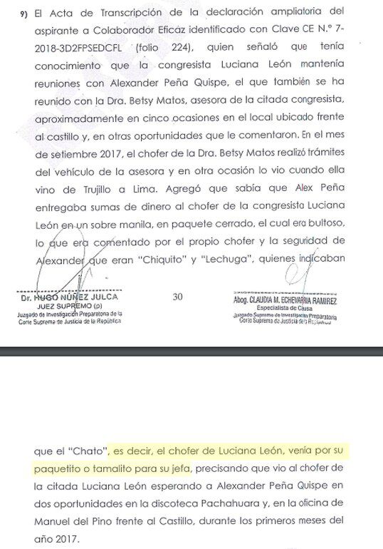 “Era comentado por el propio chofer y la seguridad de Alexander, que eran ‘Chiquito’ y ‘Legucha’, quienes indicaban que el ‘Chato’, es decir, el chofer de Luciana León, venía por su paquetito o tamalito para su jefa, precisando que vio al chofer de la citada Luciana León esperando a Peña Quispe en dos oportunidades en la discoteca Pachahuara”, se lee en el documento judicial.