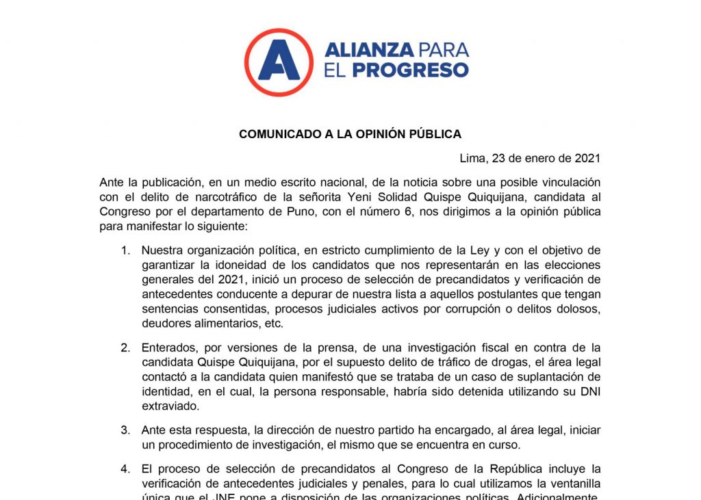 El partido Alianza para el Progreso (APP) exigió la renuncia de su candidata al Congreso por Puno, Yeni Quispe Quiquijana, acusada de transportar droga, según el informe de un diario local difundido hoy.