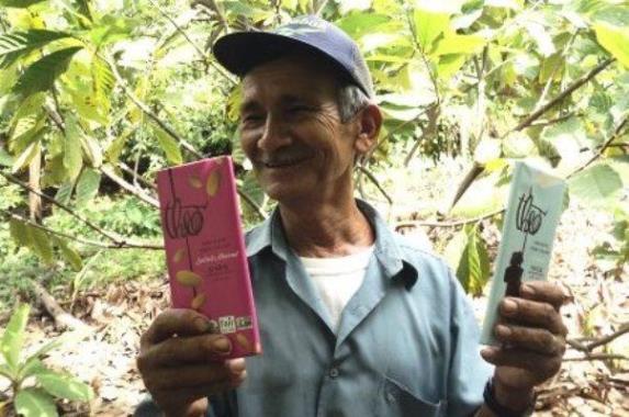 Pequeño productor de Piura muestra los chocolates Theo que fueron premiados en Washington, por la alta calidad de su cacao peruano.