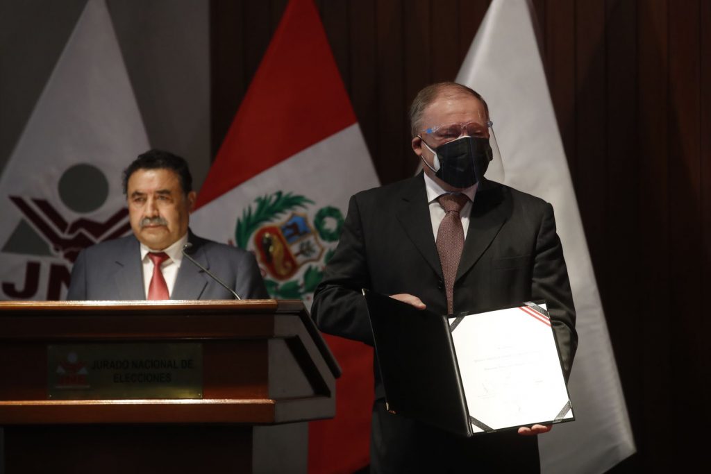 La ceremonia de proclamación y entrega de credenciales se realizó en la sede de la Comunidad Andina, hasta donde llegaron el presidente del JNE, Jorge Salas Arenas, el jefe de la ONPE, Piero Corvetto Salinas y la jefa de RENIEC, Carmen Velarde Koechlin.