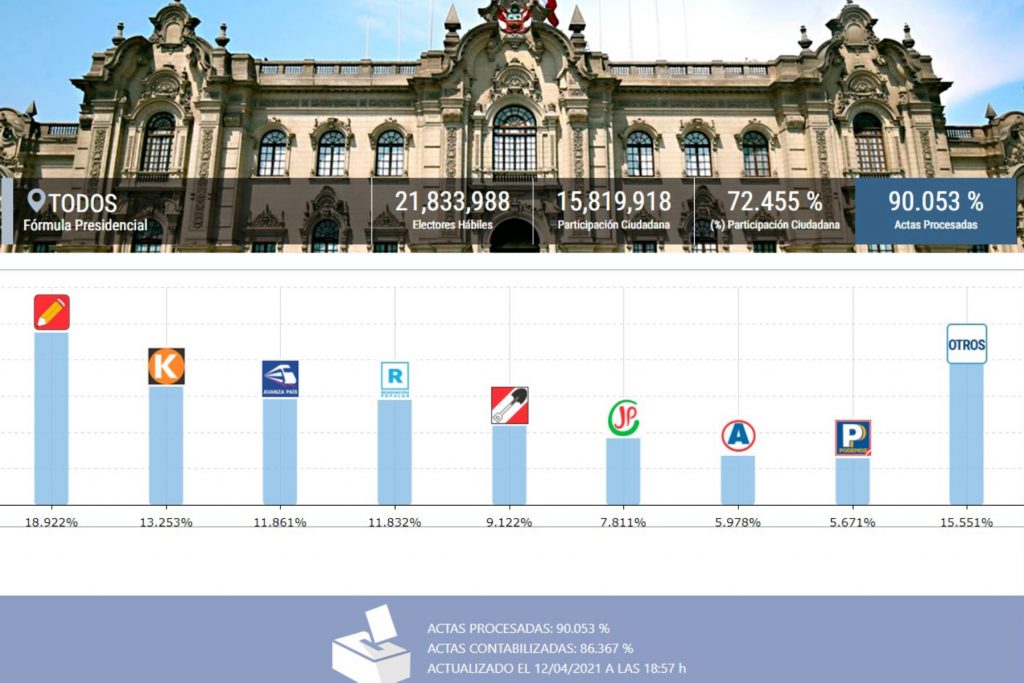 Al 90.053% de las actas procesadas por la ONPE, el candidato de Perú Libre, Pedro Castillo obtiene hasta el momento el 18.922% de los votos emitidos a nivel nacional, seguido por Keiko Fujimori de Fuerza Popular con 13.253%, Hernando de Soto de Avanza País con 11.861%;y Rafael López Aliaga de Renovación Popular con 11.832%.