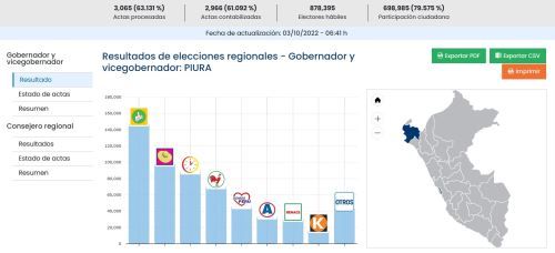 Los últimos resultados oficiales emitidos a las 06:41 horas de hoy por la Oficina Nacional de Procesos Electorales (ONPE) indicarían que habría una segunda vuelta electoral en Piura para elegir al nuevo gobernador regional para el período 2023-2026.