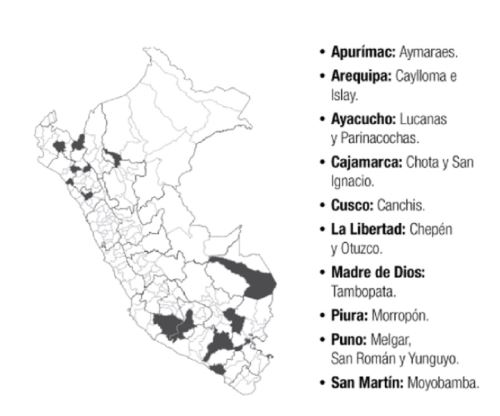 Las provincias con nivel de alerta extremo son Aymaraes (Apurímac), Caylloma e Islay (Arequipa), Lucanas y Parinacochas (Ayacucho), Chota y San Ignacio (Cajamarca), Canchis (Cusco), Chepén y Otuzco (La Libertad), Tambopata (Madre de Dios), Morropón (Piura), Melgar, San Román y Yunguyo (Puno), y Moyobamba (San Martín).
