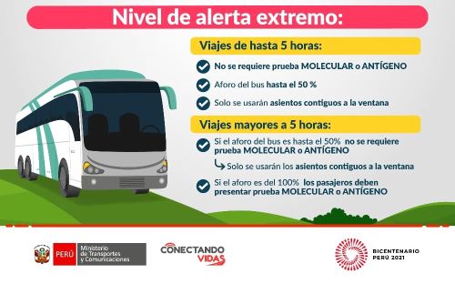Para el caso de los viajes interprovinciales en zonas de riesgo extremo con duración menor a las cinco horas no se requiere la prueba molecular o de antígeno, pero se deberá operar con un aforo del 50 % de los asientos, usando únicamente los asientos contiguos a las ventanas.