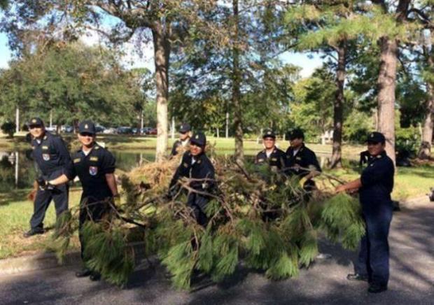 Tripulación del submarino peruano B.A.P. “Angamos” retirando árboles caídos tras el paso del huracán Mathew en la Escuela Mayport. Labor en favor de la comunidad estadounidense que fue agradecida.