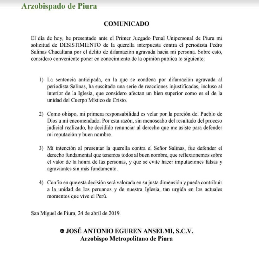 El arzobispo de Piura, José Antonio Eguren, presentó hoy ante el Primer Juzgado Penal Unipersonal de Piura una solicitud de desistimiento de la querella interpuesta contra el periodista Pedro Salinas Chacaltana por el delito de difamación agravada.