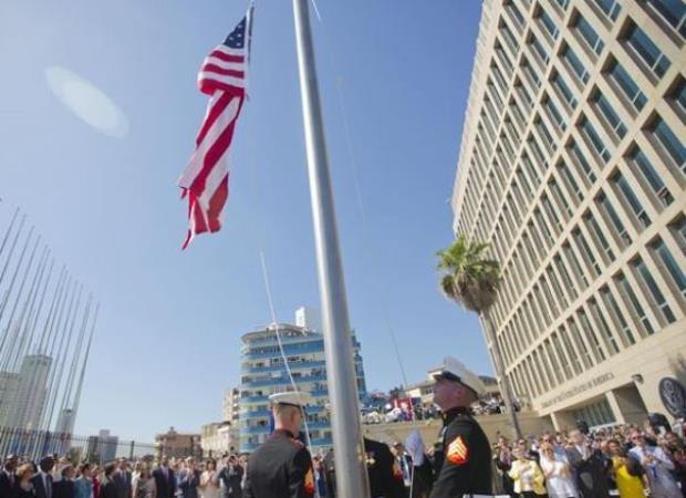 La bandera fue entregada a tres marinos que la izaron por tres militares que la habían retirado en 1961, cuando ambos países rompieron lazos diplomáticos, mientras una banda del Ejército estadounidense interpretaba el himno nacional de ese país, marcando un punto de inflexión en el camino iniciado en diciembre cuando ambos países anunciaron la normalización de sus relaciones.