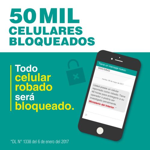 En esa misma línea, explicó que, gracias a la campaña “No te peles, hermanito”, lanzada hoy, se inhabilitarán los primeros 50,000 celulares cuyo código o serie electrónica (IMEI) figura en la “lista negra” de las empresas operadoras, al haber sido reportados como perdidos o robados.