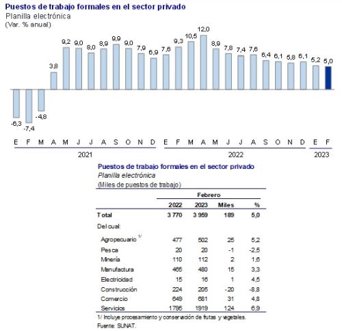 El número de puestos de trabajo formales del sector privado aumentó 5% interanual en febrero de este año, resultado positivo registrado por 23 meses consecutivos. Este avance fue impulsado principalmente por el sector servicios, en el que los puestos de empleo crecieron 6.9%, informó hoy el Banco Central de Reserva (BCR).