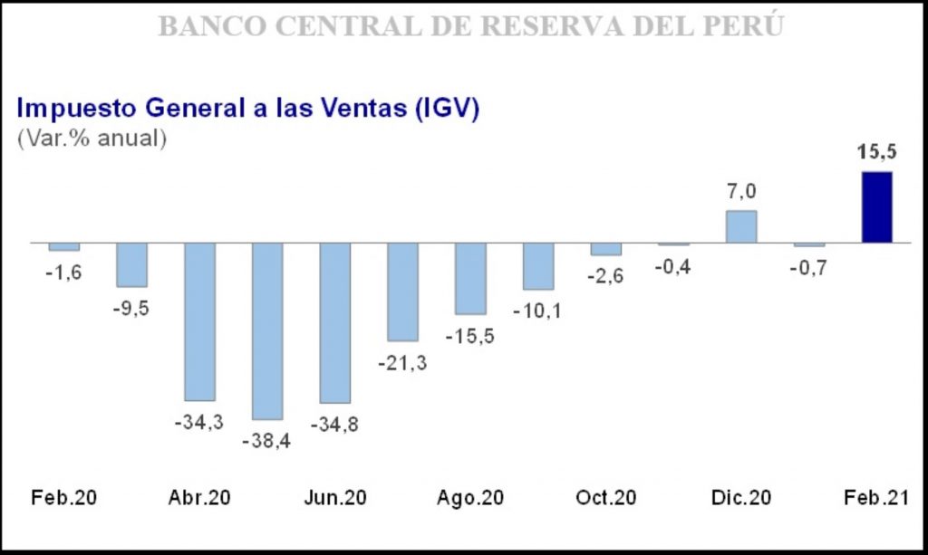 La recaudación por el impuesto general a las ventas (IGV) aumentó en febrero del 2021 en 15.5 % respecto al mismo mes del 2020, señaló hoy el Banco Central de Reserva (BCR).