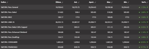 El Índice General de la Bolsa de Valores de Lima (BVL), el más representativo de la bolsa local, sube 1.72% al pasar de 19,375 a 19,709 puntos.