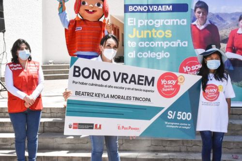 “Los escolares del Valle del Río Apurímac, Ene y Mantaro (Vraem) afrontan situaciones adversas, por eso el programa Juntos del Midis les otorga dos bonos adicionales de 300 y 200 soles por terminar el año escolar y por hacerlo en el tercio superior, respectivamente. Alentamos el esfuerzo, por eso invertimos en este valioso capital humano”, destacó.