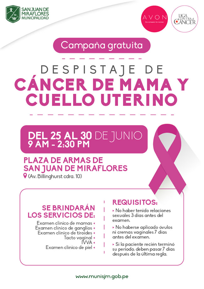DEL 25 AL 30 DE JUNIO GRAN CAMPAÑA DE SALUD GRATUITA DE PREVENCIÓN DEL CÁNCER DE CUELLO UTERINO Y DE MAMAS EN LA PLAZA DE ARMAS DE SJM