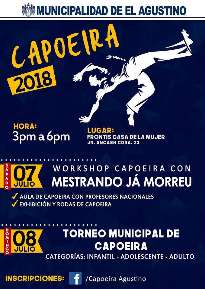 La Municipalidad Distrital de El Agustino te invita a disfrutar de una tarde en familia para ser parte del workshop de Capoeira, te esperamos el sábado 7 y domingo 8 de Julio desde las 3 pm hasta las 6 pm en el frontis de la Casa de la Mujer.