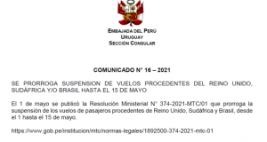 COMUNICADO N° 16 – 2021 El 1 de mayo se publicó la Resolución Ministerial N° 374-2021-MTC/01 que prorroga la suspensión de los vuelos de pasajeros procedentes de Reino Unido, Sudáfrica y Brasil, desde el 1 hasta el 15 de mayo. Así Reportó: gob.pePublicado el 3 de Mayo 2021