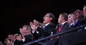 El presidente Martín Vizcarra asiste a la ceremonia de inauguración de los Juegos Parapanamericanos Lima 2019 en el Estadio Nacional. Vizcarra se encuentra acompañado de Julio César Ávila, presidente del Comité Paralímpico de las América. En el diseño del escenario de esta ceremonia de inauguración está dominado por un tótem hecho de tres obeliscos inspirados en culturas pre hispánicas. Poco ...