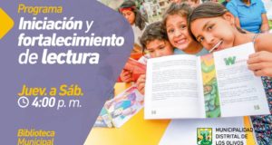La Municipalidad de Los Olivos le invita al programa de #IniciaciónYFortalecimientoDeLectura a partir de la primera semana de agosto. Jueves a sábado 4:00 p. m. En la Biblioteca Municipal Mapa del lugar: https://goo.gl/aXKzD7 ¡INGRESO LIBRE! Requisitos: ✅ Tener entre 5 a 10 años de edad. ✅ Niños de 5 años deben asistir con sus padres. Inscripciones aquí: https://goo.gl/P8QLDs En #LosOlivos ¡Vamos ...