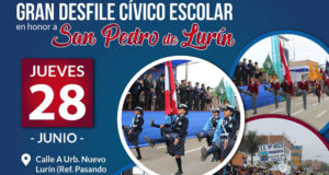 El distrito de Lurín como cada año celebra la fiesta del Santo Patrón San Pedro de Lurín el cual cuenta con una serie de eventos que no te puedes perder. Uno de los eventos sera el Desfile Cívico Escolar en Honor al Santo Patrón San Pedro de Lurín que se realizará el jueves 28 de junio. Hora: 9:00 am. Lugar: ...