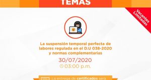 Seminarios virtuales en el marco del covid-19 💻 Participa en nuestro seminario virtual sobre suspensión temporal perfecta de labores y normas complementarias. 📆 Fecha: 30 de julio de 2020.⏰ Hora: 3:00 p. m. 🙋🏽♂️🙋🏽♀️ Inscríbete aquí: Fuente: www.facebook.com/MTPEPERU