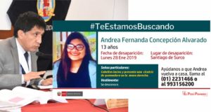 La noticia la confirmó el mismo magistrado La hija del juez Richard Concepción Carhuancho se encuentra desaparecida desde anoche confirmó el propio magistrado. Según el parte policial, la desaparición de Andrea Fernanda Concepción Alvarado de 13 años se produjo la noche del 28 de enero en el distrito de Surco. La menor responde a las siguientes características: raza mestiza, cara ...