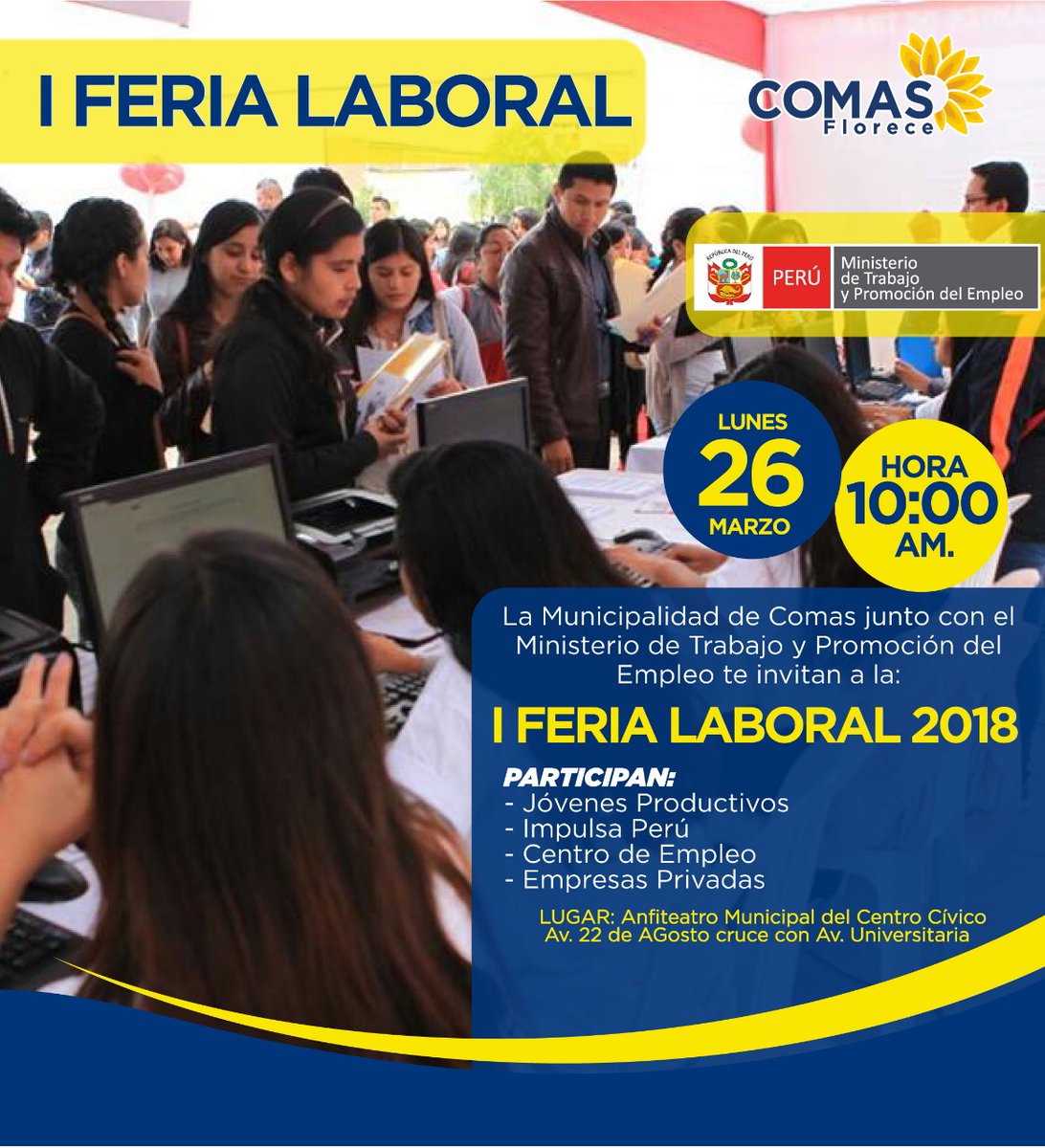 La Municipalidad de Comas y el MTPE_Perú realizaran el lunes 26 de marzo, la “I FERIA LABORAL 2018”.
