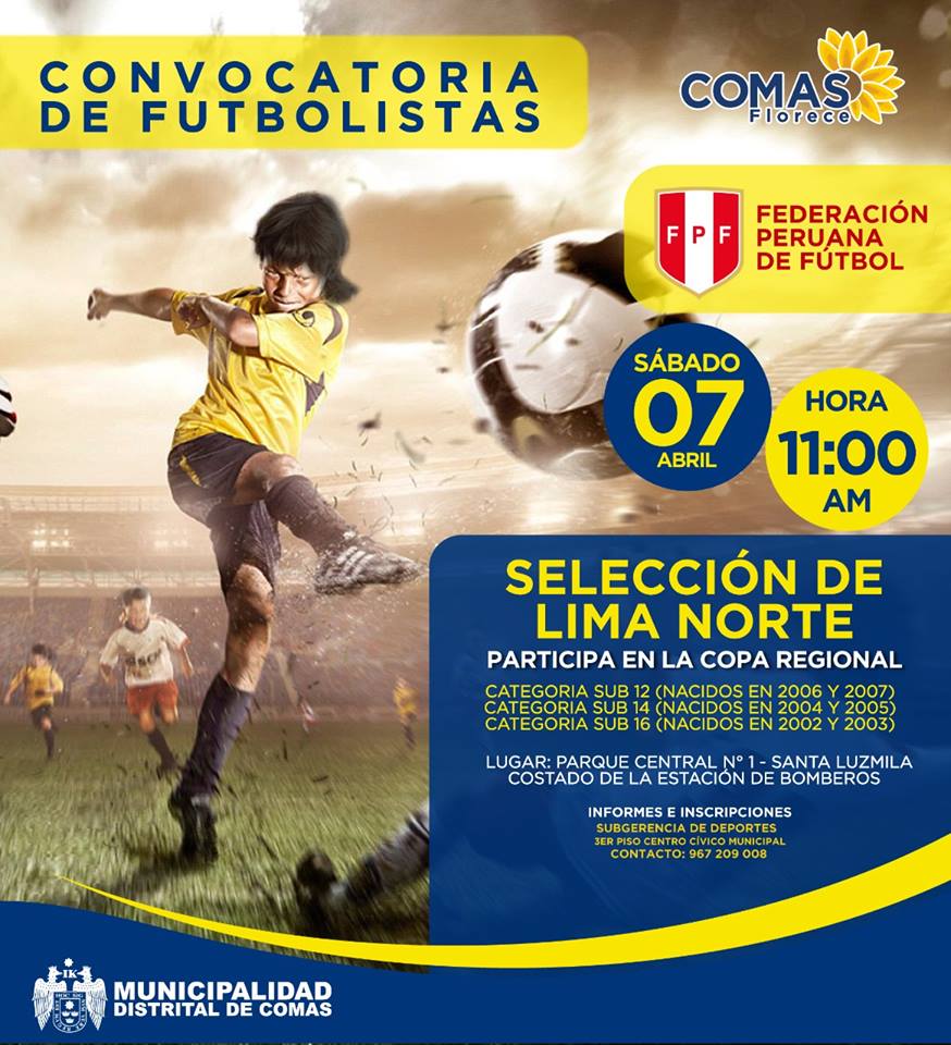 La Federación Peruana de Futbol junto a la Municipalidad de Comas invita a todos los deportistas practicantes del futbol este sábado 7 de abril a partir de las 11 am a las pruebas físicas en las categorías sub 12, sub 14 y sub 16.