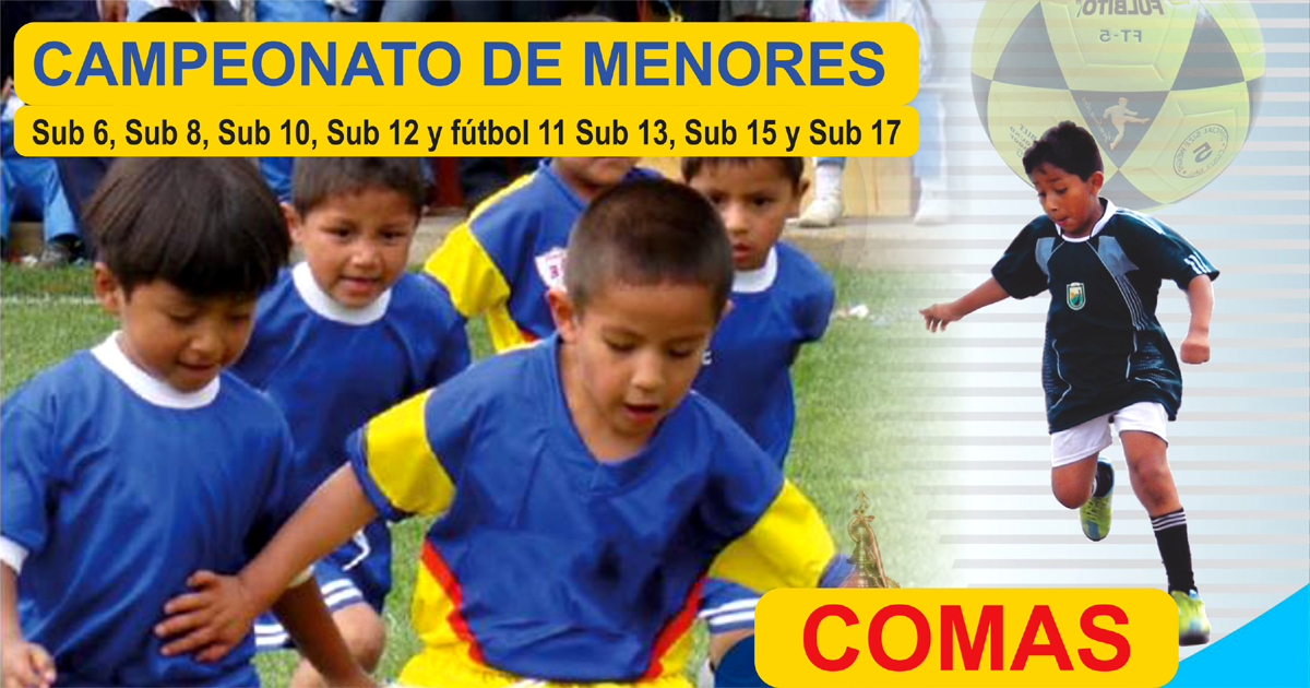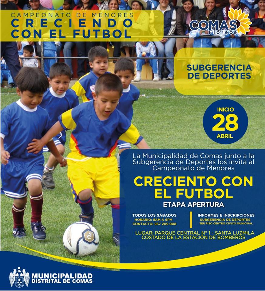La Municipalidad de Comas invita a los equipos de fútbol, academias e instituciones deportivas al Campeonato de Fútbol de menores “Creciendo con el Fútbol” Etapa Apertura, en fútbol 7 las Categorías Sub 6, Sub 8, Sub 10, Sub 12 y fútbol 11 Sub 13, Sub 15 y Sub 17.