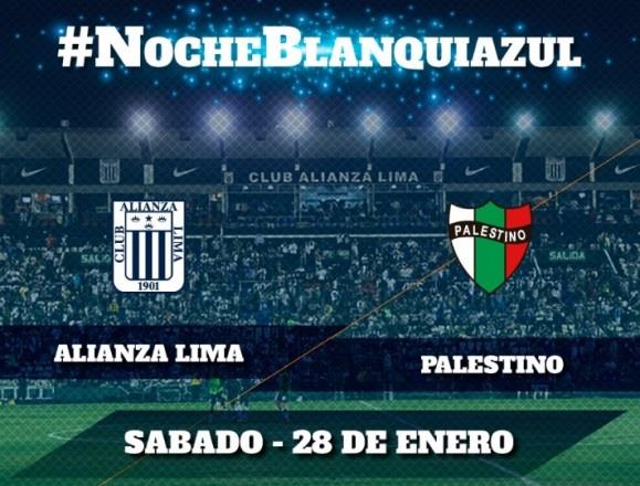 Lima, 13 enero 2017 (PeruanosNews.com).- El centenario Club Alianza Lima confirmó hoy a través de su página oficial web, que el próximo sábado 28 de enero enfrentará en un amistoso al Club Palestino de Chile, en la tradicional ceremonia especial denominada “Noche Blanquiazul”.