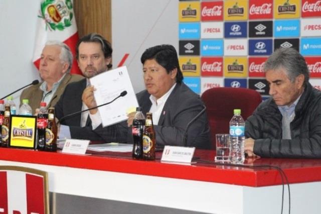 En la reunión de prensa acompañaron también al presidente de la FPF Juan Matute (secretario general), Juan Carlos Oblitas (director deportivo) y Antonio García Pye (gerente de selecciones)