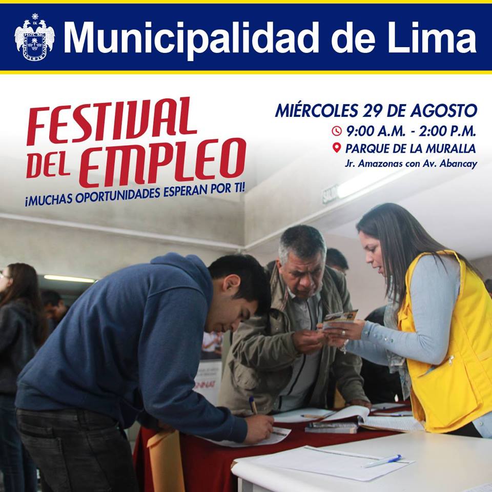 La Municipalidad de Lima organiza el “Festival del Empleo” al que puedes asistir llevando tu CV y copia DNI.