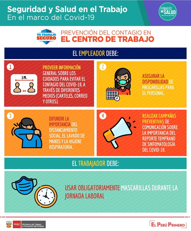 Toma nota de lo que debes de cumplir para prevenir el contagio de la COVID-19 en tu centro de trabajo, marco de la Seguridad y Salud en el Trabajo.