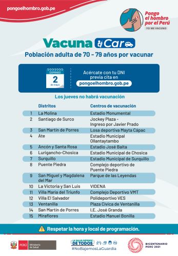 Para brindar una atención más rápida y cómoda a los adultos mayores, podrán acudir a su punto de inmunización en sus vehículos (autos y mototaxis) y ser inoculados sin necesidad de bajar de él. En el siguiente cuadro se indican los puntos VacunaCar que se han establecido a partir del 2 de mayo.
