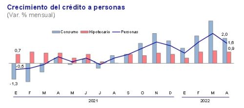 En términos mensuales, el crédito a personas aumentó 1.6% en abril respecto a marzo, acumulando nueve meses consecutivos de expansión, reportó.