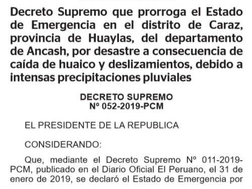 El Gobierno prorrogó también esta medida en las regiones Áncash y Cusco. El Decreto Supremo N° 052-2019-PCM, prorroga el estado de emergencia en el distrito de Caraz, provincia de Huaylas, en Áncash, por desastre a consecuencia de caída de huaico y deslizamientos, debido a las lluvias intensas.
