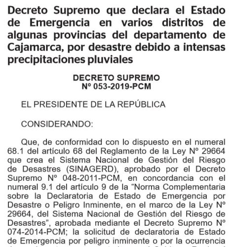 La primera norma es el Decreto Supremo N° 053-2019-PCM que declara el estado de emergencia en varios distritos de algunas provincias del departamento de Cajamarca, por desastres debido a intensas precipitaciones pluviales.