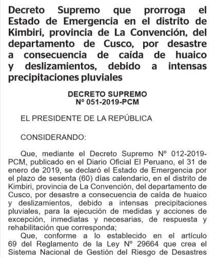 Por último, el Ejecutivo prorrogó, mediante el Decreto Supremo N° 051-2019-PCM, el estado de emergencia en el distrito de Kimbiri, provincia de La Convención, del departamento de Cusco, por desastre a consecuencia de caída de huaico y deslizamientos, debido a intensas precipitaciones pluviales.