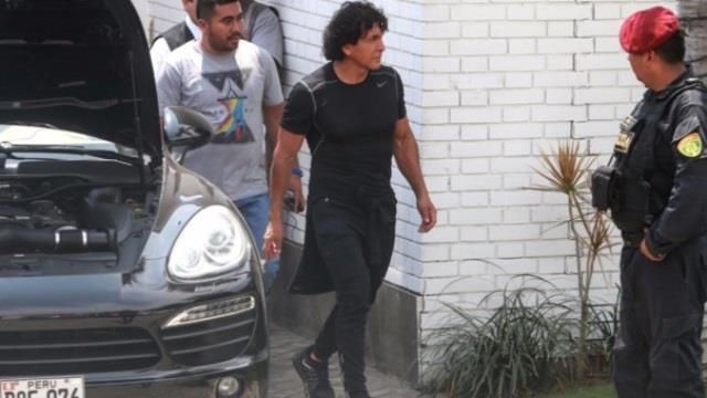 El empresario Pedro Pérez Miranda sale custodiado por la policía de su domicilio en La Molina, donde incautaron lujosos vehículos y armas de fuego. En operativo allanaron 10 inmuebles y detuvieron a 6 personas.
