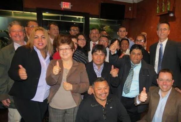 El peruano Luis Marino celebrando su reelección al lado del alcalde de Port Chester, Dennis Pilla; el senador George Latimer; los concejales reelectos demócratas Daniel Brakewood y Greg Adams; sus coordinadores de campaña Marcela Kissner y Luis Yumbla; miembros de la comunidad y su familia.