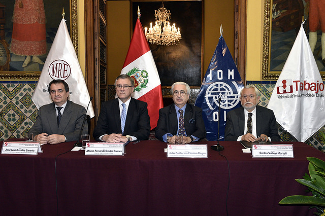 El acto se realizó en la sede de la Cancillería y contó con la asistencia del ministro de Trabajo y Promoción del Empleo, Alfonso Grados; el jefe de la Misión en el Perú de la Organización Internacional para las Migraciones, José Dávalos; el director general de Comunidades Peruanas en el Exterior y Asuntos Consulares de la Cancillería, embajador Julio Florián; y el director de la Mesa de Trabajo Intersectorial para la Gestión Migratoria, Carlos Vallejo.