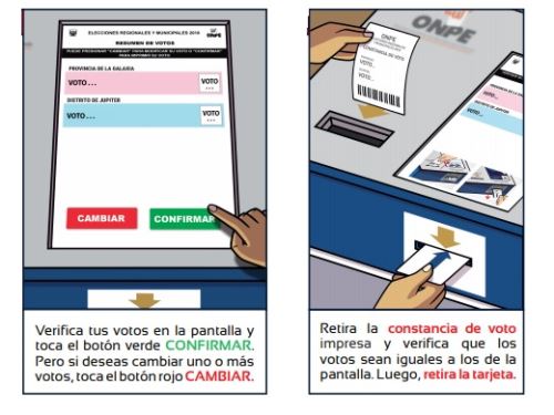 Paso 4. La máquina te mostrará un resumen con las opciones que has escogido a nivel regional, provincial y distrital. Si estás de acuerdo, presiona “confirmar”, de lo contrario presionas la opción “cambiar”. Puedes modificar uno o más votos.