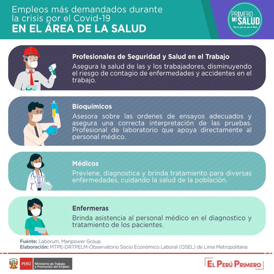 Empleos más demandados durante esta crisis por COVID-19 Posted by: Peruanosnews1 Conoce cuáles son los empleos más demandados durante esta crisis por COVID-19 en al área de salud. Fuente: @MTPEPERU Empleo 2020-07-13 Peruanosnews1