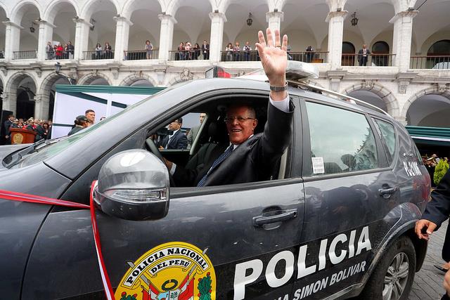 El presidente de la República aprovechó su estadía en Arequipa para entregarle 93 patrulleros nuevos para ser distribuidos en las diversas comisarías mistianas, que permitirán intensificar el patrullaje y reducir los índices de inseguridad ciudadana que se presentan en esta región.