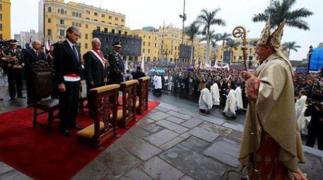Momentos antes, el mandatario asistió a la misa que se realizó en el atrio de la Catedral de Lima, en la Plaza Mayor de la capital, que se vio colmada de fieles y batallones de cadetes y efectivos de la Policía Nacional del Perú (PNP). Fue oficiada por el cardenal Juan Luis Cipriani, Arzobispo de Lima.