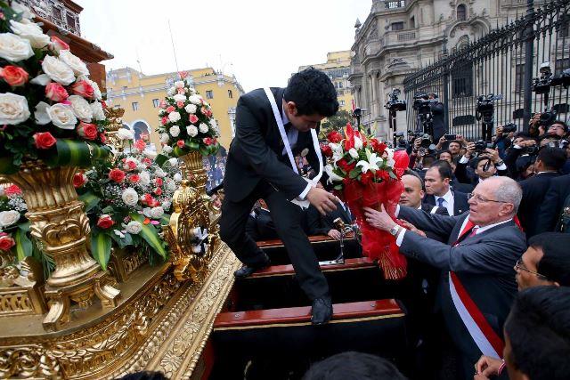 El presidente Kuczynski expresó breves declaraciones a la prensa, en la puerta del Palacio de Gobierno, luego de entregar con unción religiosa una ofrenda floral en honor de Santa Rosa de Lima, que en esos momentos realizaba su tradicional recorrido procesional por el centro de Lima.