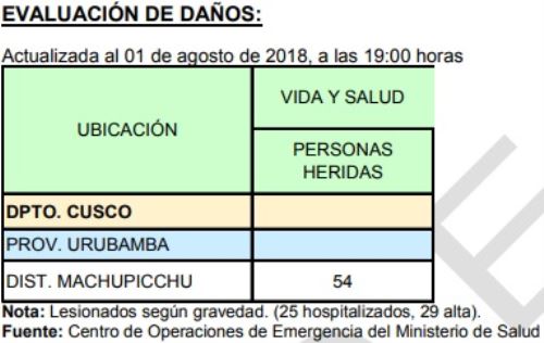 El choque de trenes en la vía férrea Ollantaytambo-Machu Picchu, región Cusco, dejó un total de 54 heridos. De ese número, 25 –en su mayoría extranjeros- permanecen hospitalizados y 29 fueron dados de alta, según la actualización de daños hasta las 19:00 horas de ayer, publicado por el Instituto Nacional de Defensa Civil (Indeci).