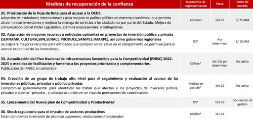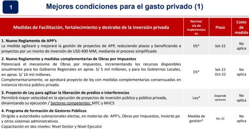 – Las medidas para aceleración de la inversión pública por 5,262 millones de soles, que representan 0.55% del PBI de este año, tendrán un impacto de 0.1 puntos porcentuales en el PBI del 2022 y de 0.5 puntos en el PBI del 2023.