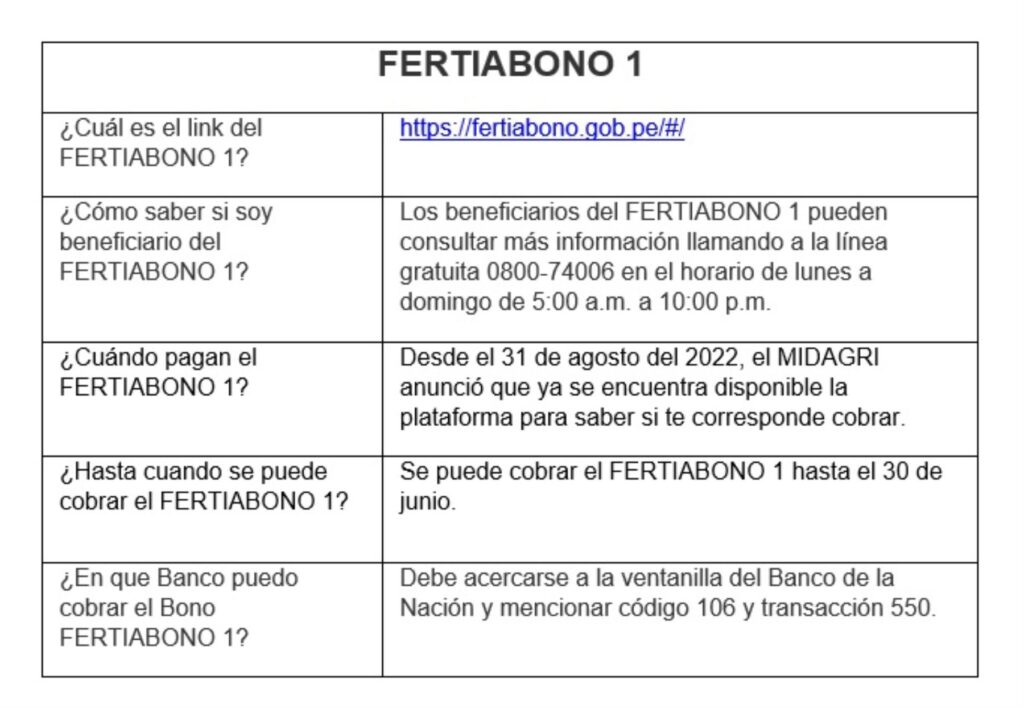El Ministerio de Desarrollo Agrario y Riego (Midagri) indicó hoy que este 30 de junio vence indefectiblemente el cobro del Fertiabono 1, por lo cual invocó a los pequeños agricultores del país que aún no lo han cobrado a que se acerquen a las agencias del Banco de la Nación.