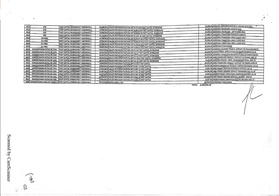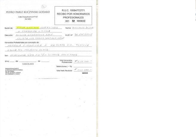 Comentó también que presentó una factura a First Capital, en la que no guarda relación alguna con la empresa Odebrecht. Los ingresos fueron declarados públicamente y se efectuó el pago de los respectivos impuestos, en el año 2012, pues nunca tuvo la menor intención de ocultar nada.